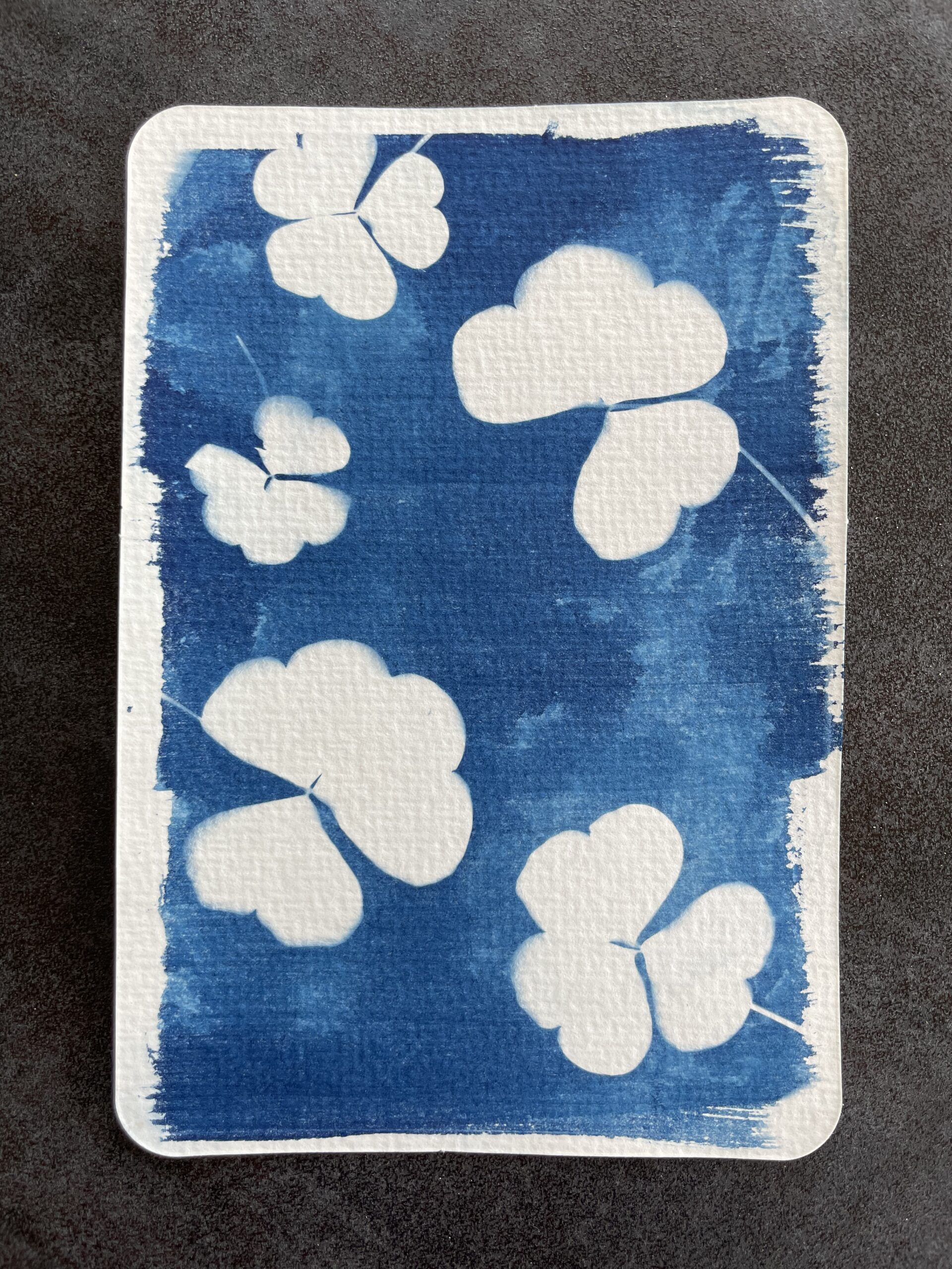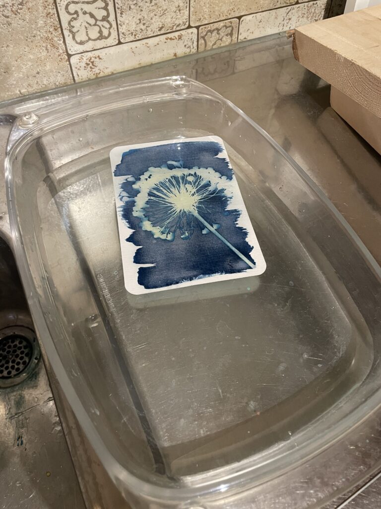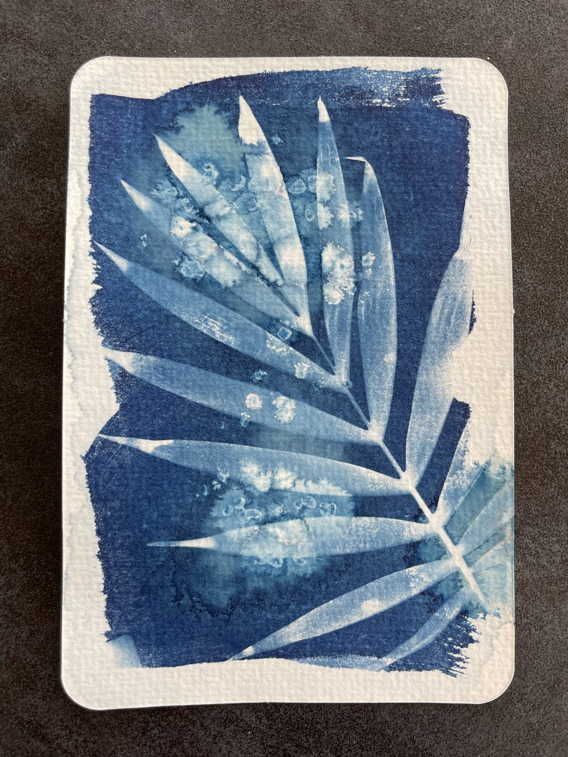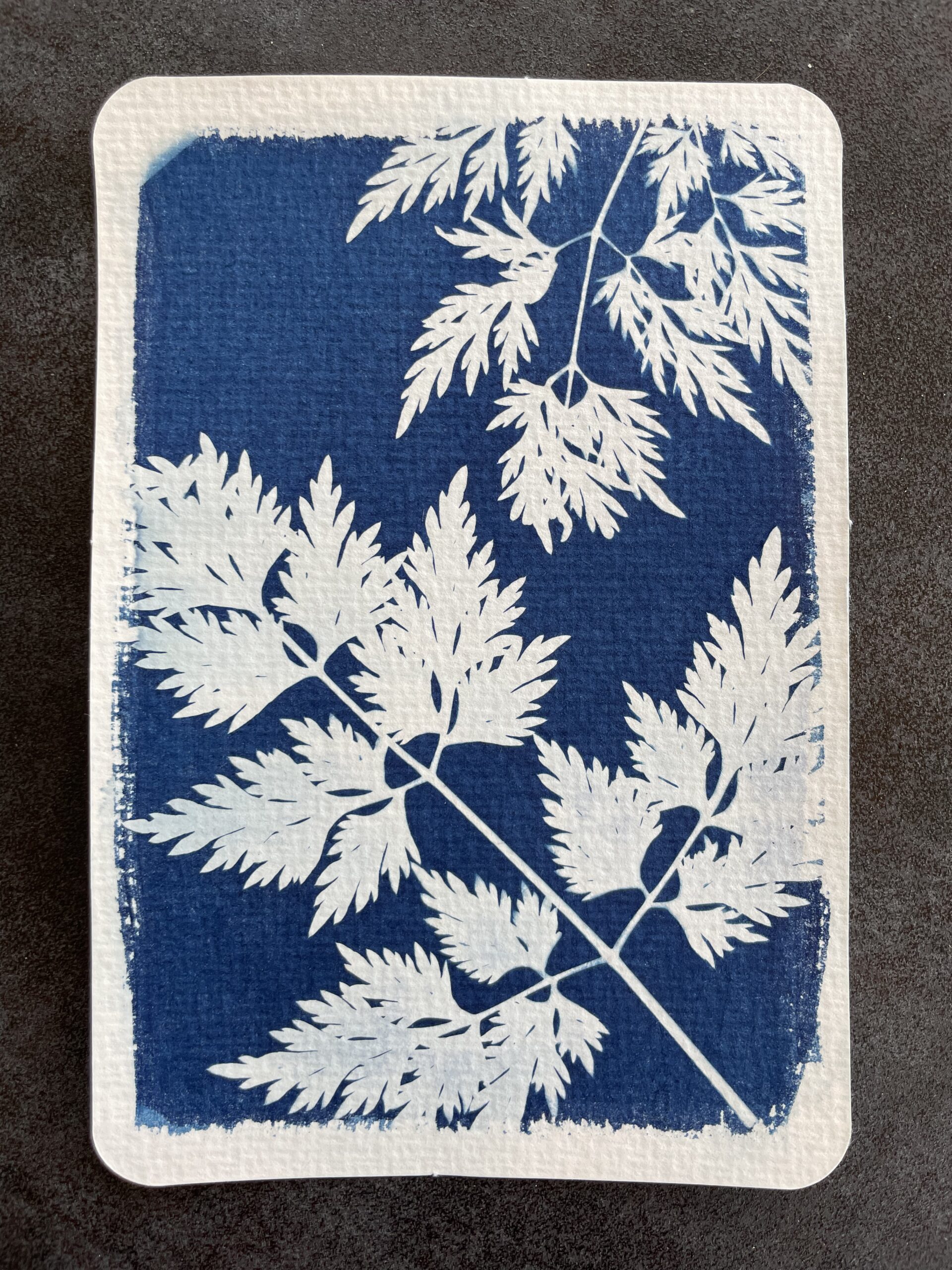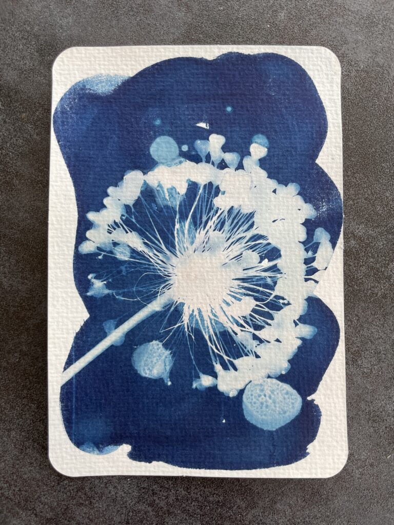Cyanotyping is essentially a photographic process that produces a copy (called a blue print) of the original, printing the image using UV light (either sunlight or artificial). Negatives or even flat objects can be used to create a positive image. In this method of printing, first the paper (ideally watercolour) is coated with a solution made up of ferric ammonium citrate, potassium ferricyanide and distilled water. Once dry the photosensitive paper can be exposed to UV light, with the negative or object sandwiched between the paper and a clean pane of glass. After exposure the paper is submerged in a water bath for development where the image will fixed in blue tones.